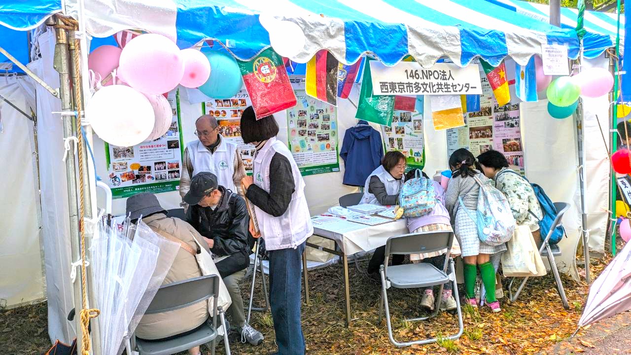 西東京市民まつり(11/8~9)にNIMICブースを出展しました。延べ22人の当日ボランティアの協力がありました。2日目は雨模様で来場者が少なめでしたが、ブース立ち寄りは2日間で345人となりました。ブース内での防災の「やさしい日本語」クイズで、若い米国人が「断水」の小さなフリガナの「だ」を濁点なしの「た」と読み違えたらしく「淡水」に相応する回答がないという質問があり、生活に関する漢字語彙の難しさをと大切さを改めて痛感する一幕もありました。