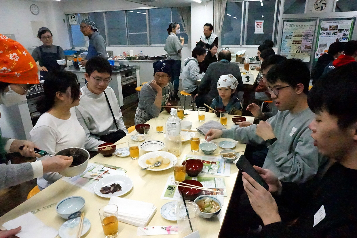 日本のいろいろな種類のお餅(雑煮、あんこ、きなこ等)を皆で準備し、食べます。その後に日本の伝統的なお正月遊び(すごろく、福笑い、かるた等)と書き初めをするイベントです。